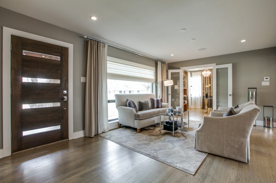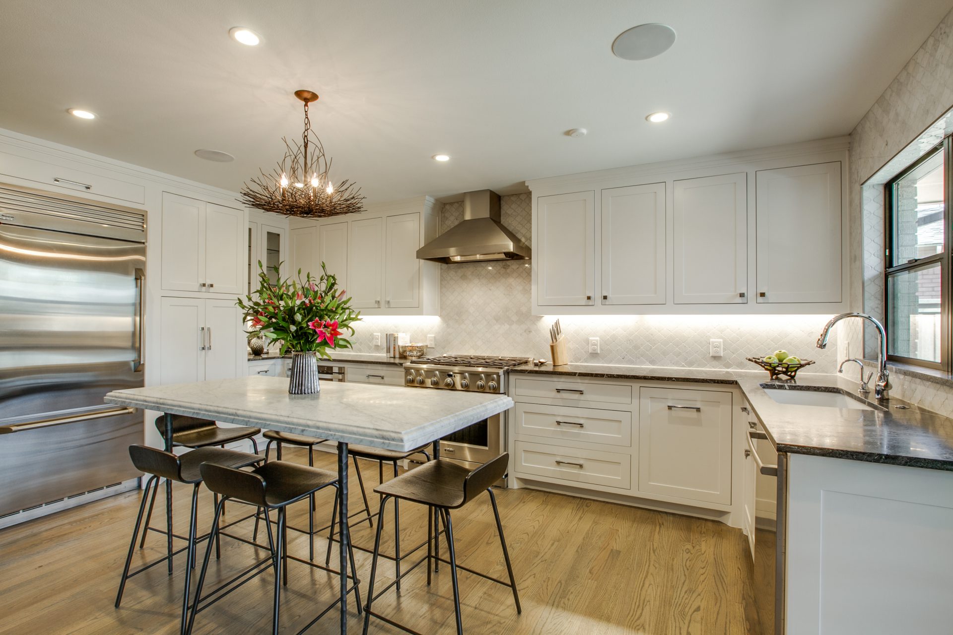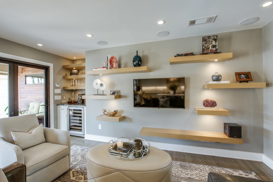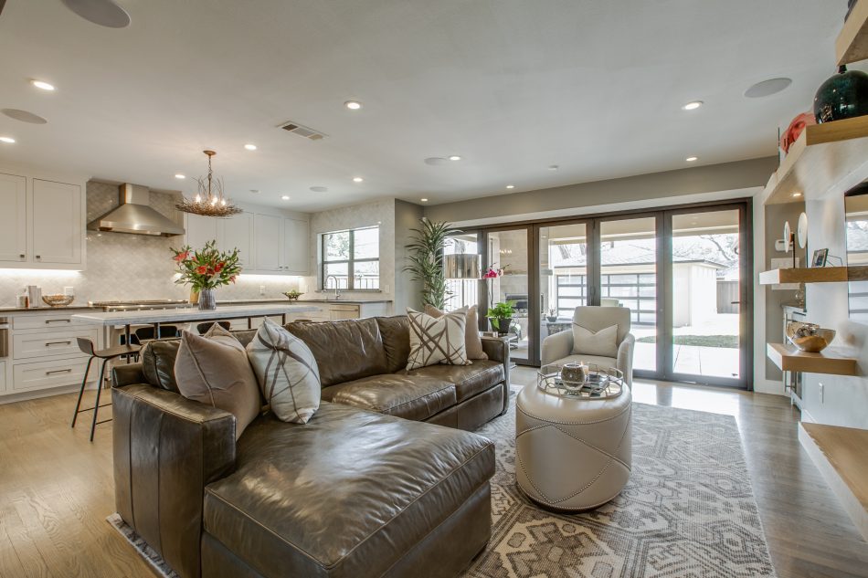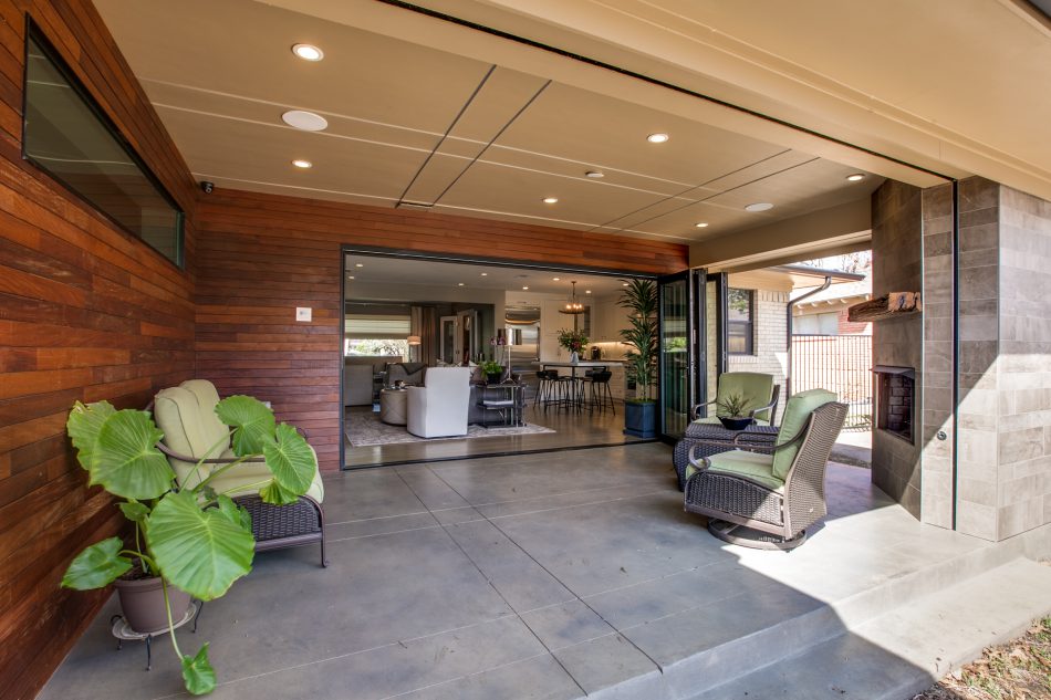 Built in 1954, this Lake Highlands home was transformed from a traditional layout to a more open floor plan designed for year-round entertainment. In addition to reorganizing the entire interior space, a 12-foot-wide folding door opens up the living space to a new rear porch featuring an outdoor fireplace and automatic screens. A new master suite was added as well, featuring an expansive master shower, floating wood shelves and beautiful cabinetry and tile work.