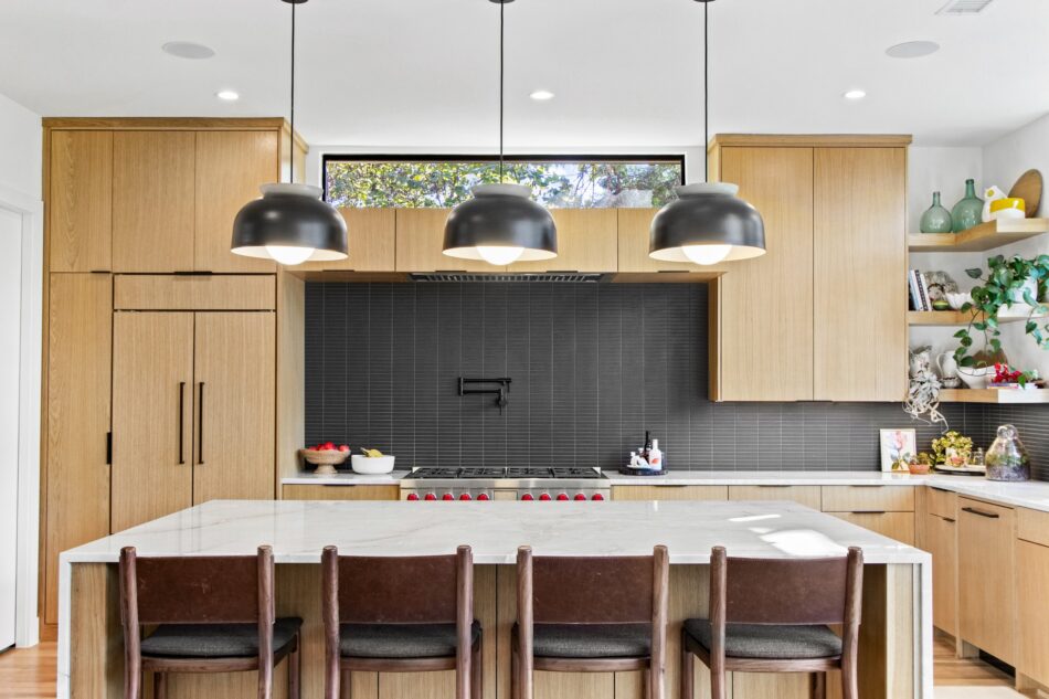 The design features clean mid-century lines layered with organic textures, curated color moments, and a mix of vintage-inspired and contemporary details. Natural light anchors the space, highlighting the warm woods, earthy hues, and playful yet refined palette the homeowners were drawn to.